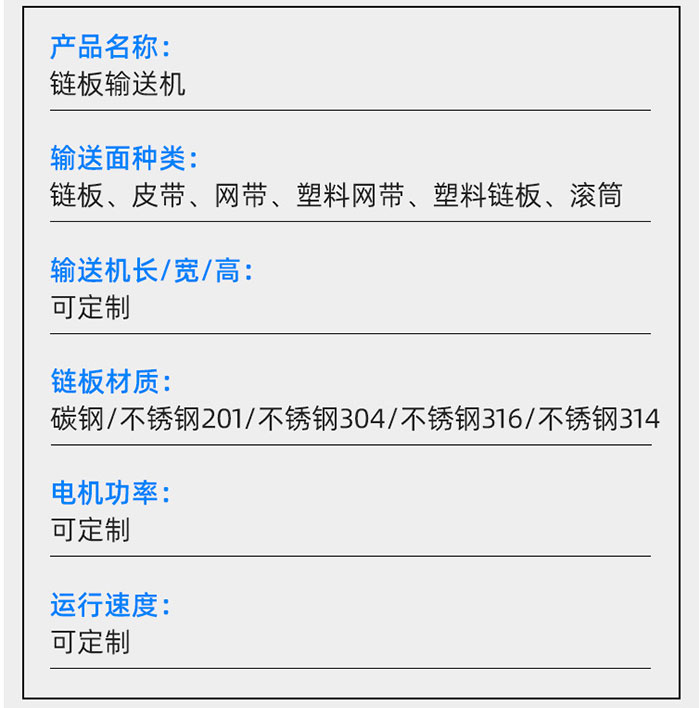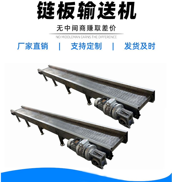 鏈板輸送機是一種以標準鏈板為承載面,由馬達減速機為動力傳動的傳送裝置。鏈板式輸送機,由動力裝置(電機)、傳動軸、滾筒、張緊裝置、鏈輪、鏈條、軸承、潤滑劑、鏈板等等構成。其中帶動物料的輸送的主要的兩個部分為:鏈條,利用它的循環往復運動提供牽引動力;金屬板,作為輸送過程中的承載體。可以通過多列鏈板并行,使鏈板輸送機做的很寬并形成差速,利用多列鏈板的速度差使多列輸送在無擠壓的情況下變為單列輸送,從而滿足飲料貼標、灌裝、清洗等設備的單列輸送的要求,我們可以將兩條鏈板輸送機的頭尾部做成重疊式的混合鏈使得瓶(罐)體處于動態過度狀態,使輸送線上不滯留物料,可以滿足空瓶以及實瓶壓力和無壓力輸送。