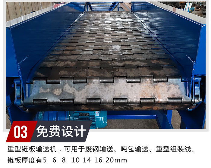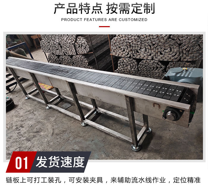 載重鏈板式輸送機是一種利用循環往復的鏈條作為牽引動力,以金屬板作為輸送承載體的一種輸送機械設備。 鏈板式輸送機組成:鏈板輸送機以標準頂板鏈為承載面,由馬達減速機為動力傳動,運行在導軌中,根據工藝流程不同,鏈板分為轉彎及直線型。 鏈板式輸送機材質:碳鋼、不銹鋼,根據實際需要可選取不同寬度、不同形狀的鏈板來完成直線、轉彎、升降等要求。 特點:具有耐磨、防腐、結構精密、運行平穩等特點,可實現自動輸送、分級包裝。 適用范圍:鏈板輸送機廣泛應用于食品、罐頭飲料、化妝品洗滌產品等行業,特別適用于大體積重貨的運輸。