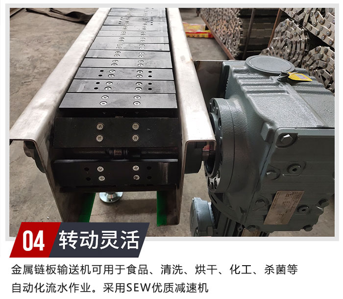 鏈板輸送機可以滿足飲料貼標、灌裝、清洗等設備的單列直線輸送的要求,同樣也可以使單列變成多列并行走緩慢,從而產生儲存量,滿足殺菌機、儲瓶臺、冷瓶機的大量供料的要求,我們可以將兩條鏈板輸送機的頭尾部做成重疊式的混合鏈,使得瓶(罐)體處于動態過度狀態,使輸送線上不滯留瓶子,可以滿足空瓶及實瓶的壓力和無壓力輸送。
